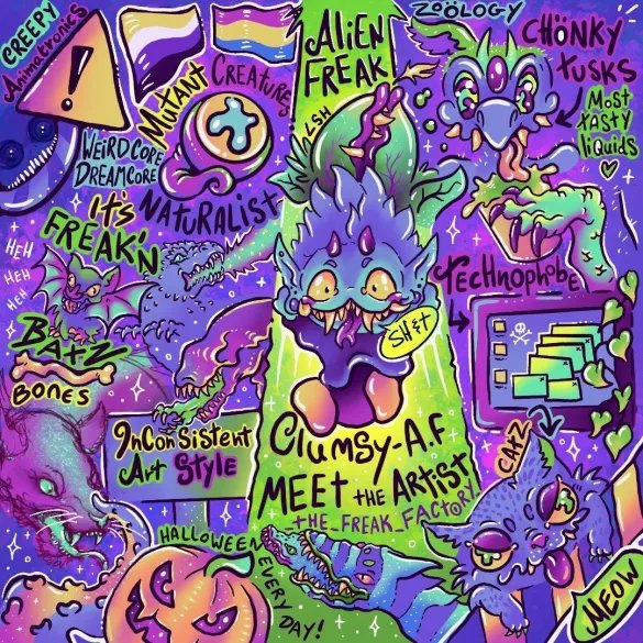 ✨ Favouring Ultra Violet paints, Polymer clays, Mache's, large scale plushes, Gouche, imbedding electronics & in recent years 3D Printing.